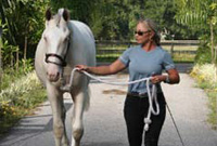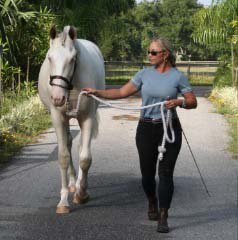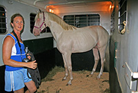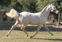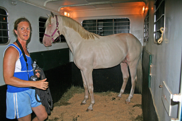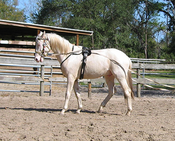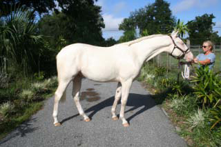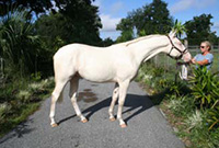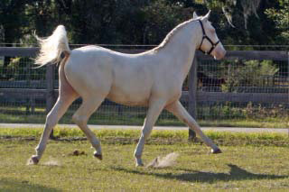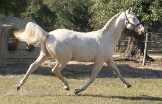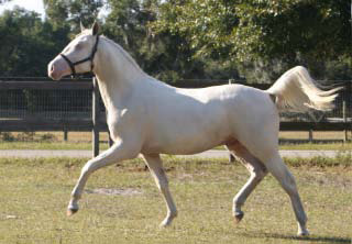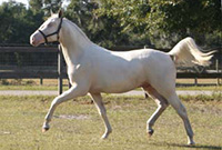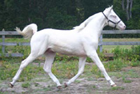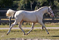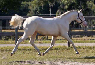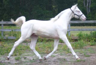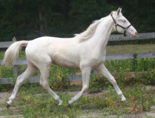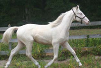 2007 Rare cremello warmblood stallion prospect. The first cremello warmblood born in the USA. He is by Blue Eyed Dream and out of Nanett. He is registered with the American Warmblood Registry and is also eligible for the Rheinland Pfal-Saar. He has a blaze and hind stockings. We expect Ghost will mature to atleast 16.2 hands, already stands 15.3 hands at 22 month's old. Ghost is broke to long-line and accepts the bridle and surcingle beautifully. He will produce palomino and buckskin warmblood offspring. Awarded First Premium with AWR.