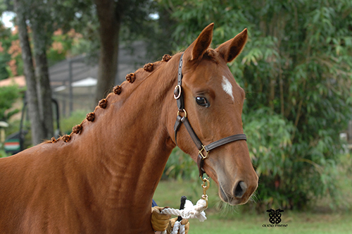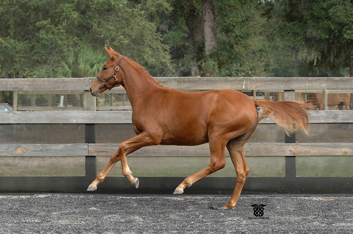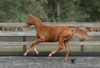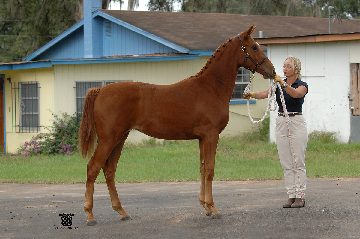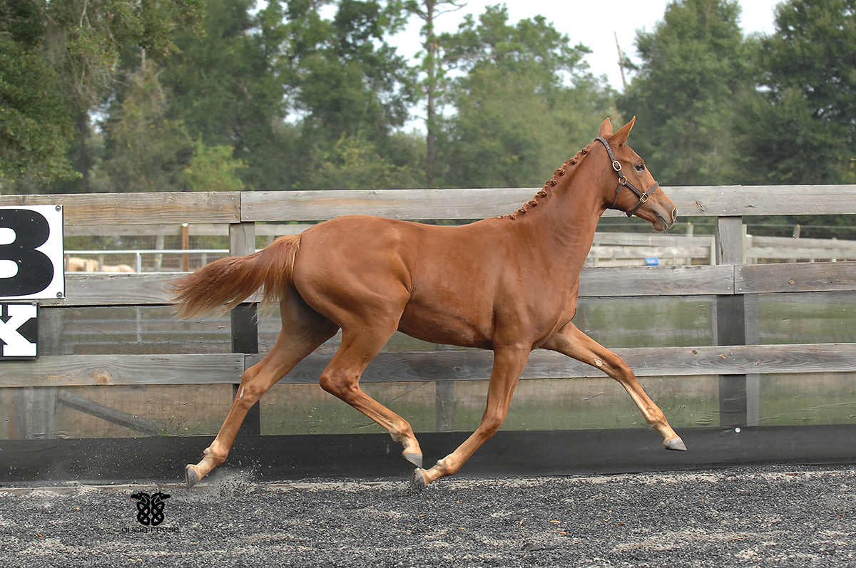Liberty Gold is a 16.2 hand chestnut stallion by Londonderry by Walida (by Weltmyer). Double Champion of both his Stallion Licensing in Verden and of the 11 month performance test at Adelheidsdorf, Germany. In 2005 he was awarded Grand Champion at Devon. In 2003 at his licensing Liberty took highest honors, excelling in his basic gaits, free jumping, confirmation, and overall suppleness. In 2004 he was victorious at Adelheidsdorf with a dressage index of 147.75 and an overall score of 140.93. When the final scores were tallied, we were astonished with his results: Liberty Gold scored 9.33 on trot, 9.5 on canter, 8 on walk, 9 on Character and Temperament, 9.667 on Rideability, and a 9 on his willingness to work.