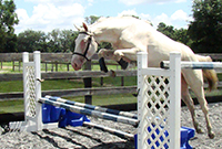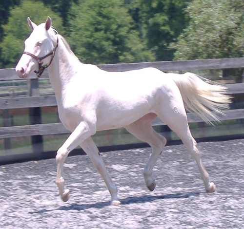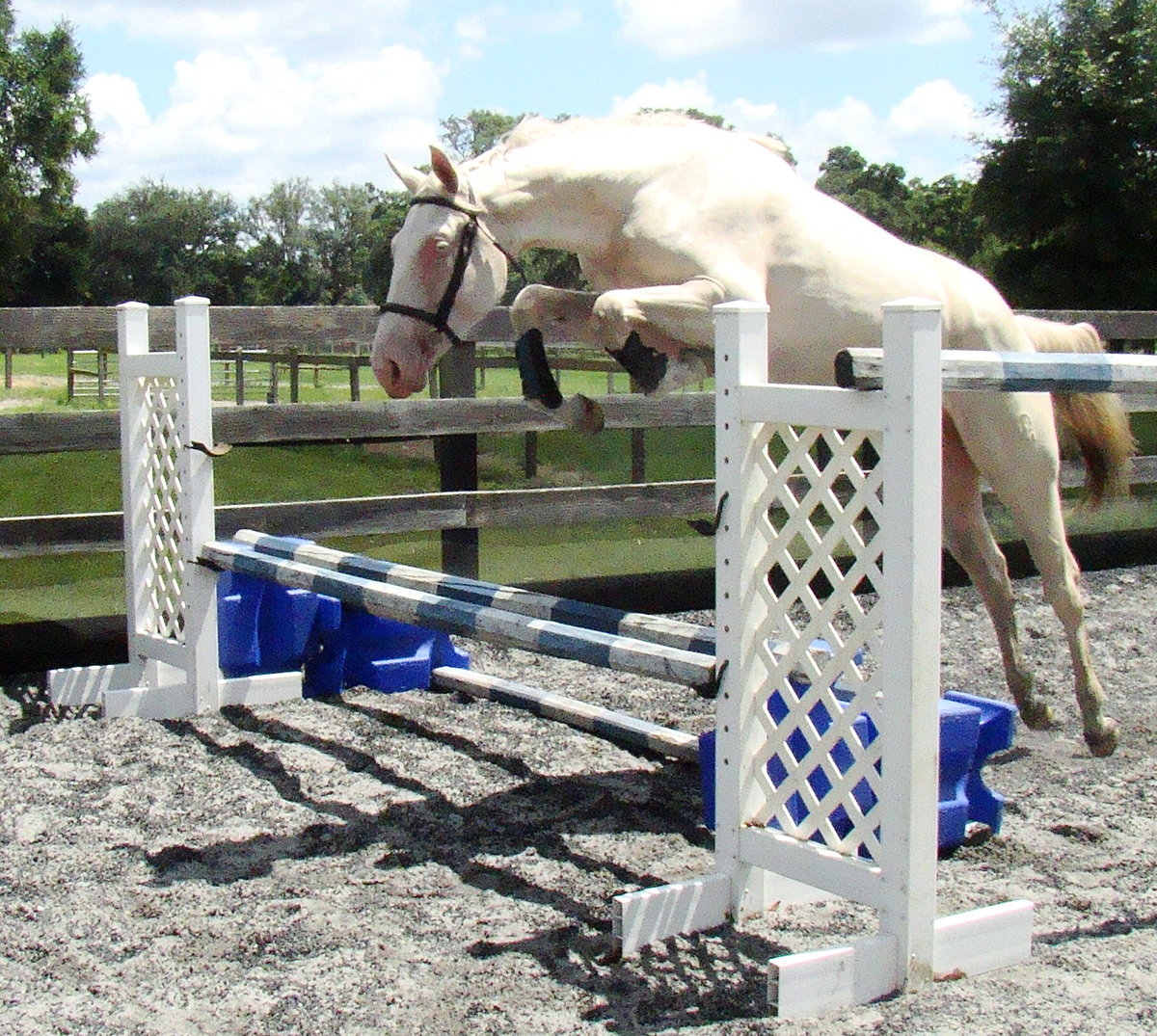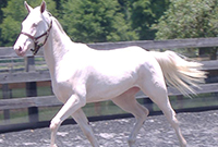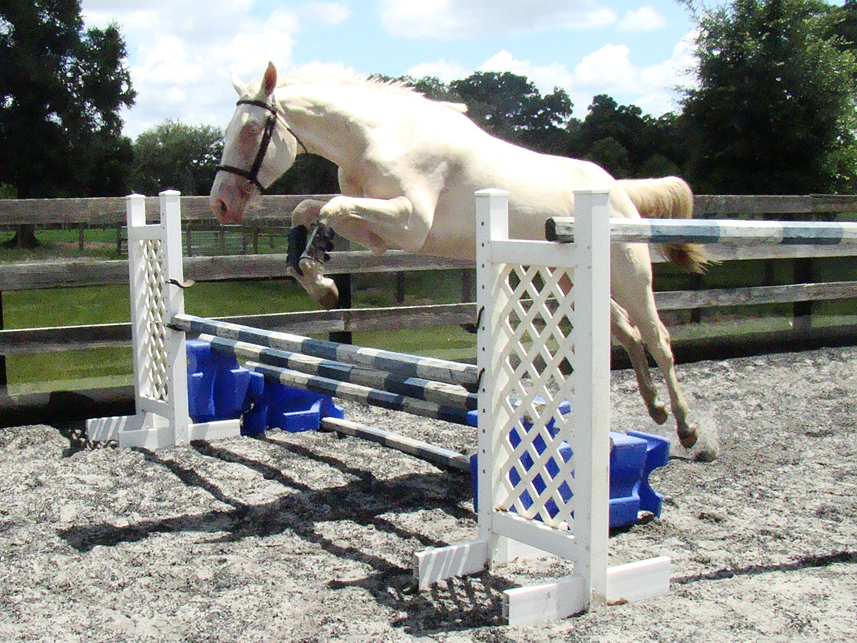This filly is our first cremello sabino filly born, the first cremello warmblood filly born in the USA and the first born via embryo trasnfer. She has a very loving personality along with her sires charm. She a tall leggy girl with uphill build, a cute blaze and 3 socks. Moksha can be bred to any chestnut stallion in the world and will produce a palomino 100% of the time, when bred to bay stallion she will produce palomino or buckskin foals. She would be a great asset to any breeding program! Her dam Marigold is a First Premium Premier AWR mare and stands 16.3 and Marigold's sire Mascarpone was a very respected 16.3 hand cremello stallion in the breeding industry. Her sire is the top competing 16 hand cremello stallion in the USA (Blue Eyed Dream GF) and his sire is the 16.2 hand palomino stallion Blonder Hans. Blue Eyed Dream GF offspring have consitently grown-up to 16.2 hand,, we expect Moksha will be atleadt 16 hands.. Moksha is one of the last carriers of the Mascarpone line. Moksha was recently broke to long-line and accepts to bridle and surcingle like a pro! She is shown belowe free-jumping for the first time and shows excellent form and was very brave over the fences! Don't miss a opportunity to own a rare cremello mare with excellent bloodlines, movement and tempermant!